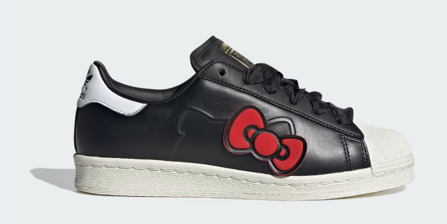 滑らかなレザーアッパーにハローキティのトレードマークであるリボンをあしらい、クラシックなシェルトゥシューズに、楽しいアクセントを添えています。