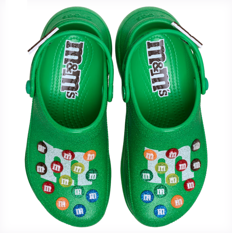 もうひとつの注目アイテムは「ベイクロッグ」。きらめくグリッター加工が光を受けて輝き、トップには虹色のM&M’Sキャンディが散りばめられています。甘いスイーツのような見た目は、足元を主役にしてくれる華やかさ。カジュアルなシーンからちょっとしたお出かけまで、気分を高めてくれる特別な存在です。