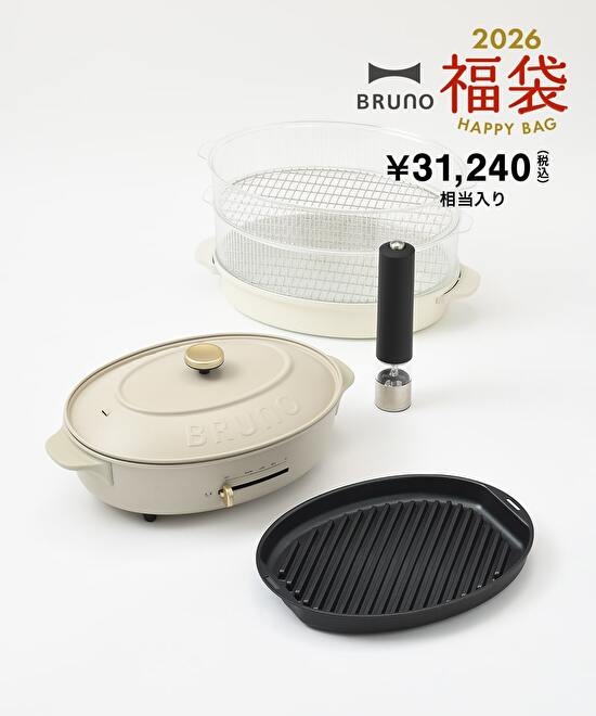 食卓に馴染むオーバルデザインのホットプレートをメインに、料理の幅が広がるスチーマーやグリルプレートなど計4点入りの福袋
