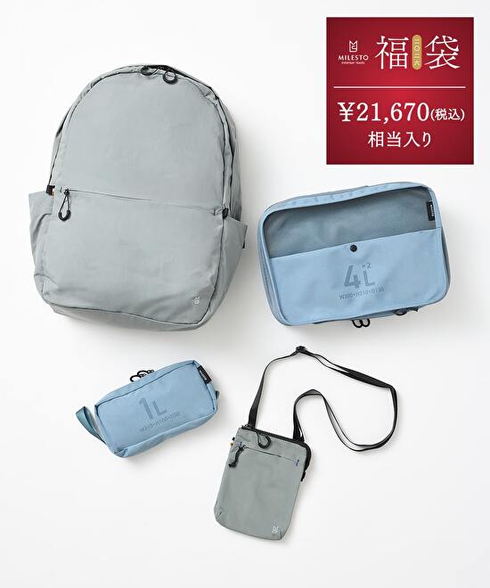 収納力・軽さ・耐水性に優れたTROT バックパックLをメインに、サコッシュや圧縮オーガナイザー、ポーチを組み合わせた計4点入りの福袋
