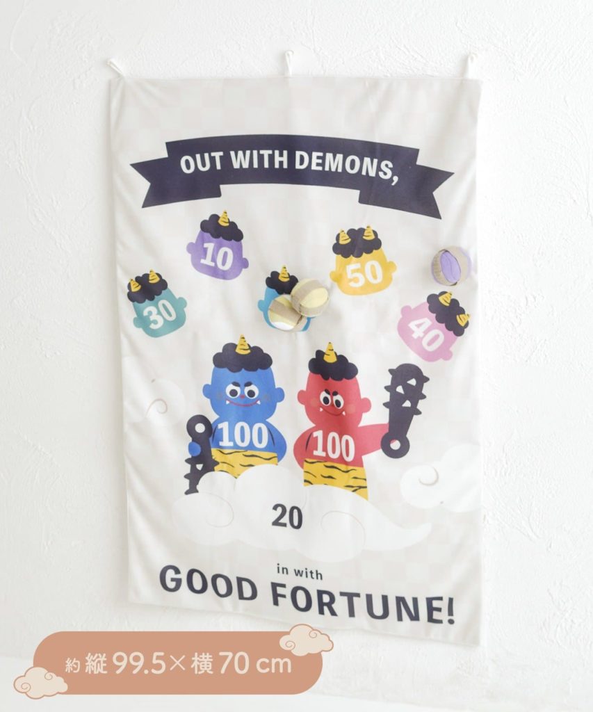 付属のボールを「えいっ」と投げて、的に当たれば点数ゲット。おうちに飾るだけで、節分ムードがふんわり高まる豆まきタペストリーです。