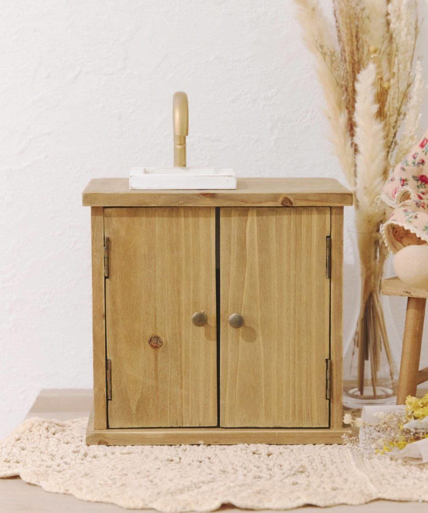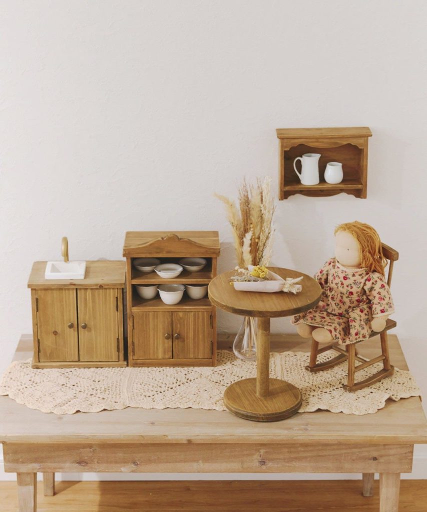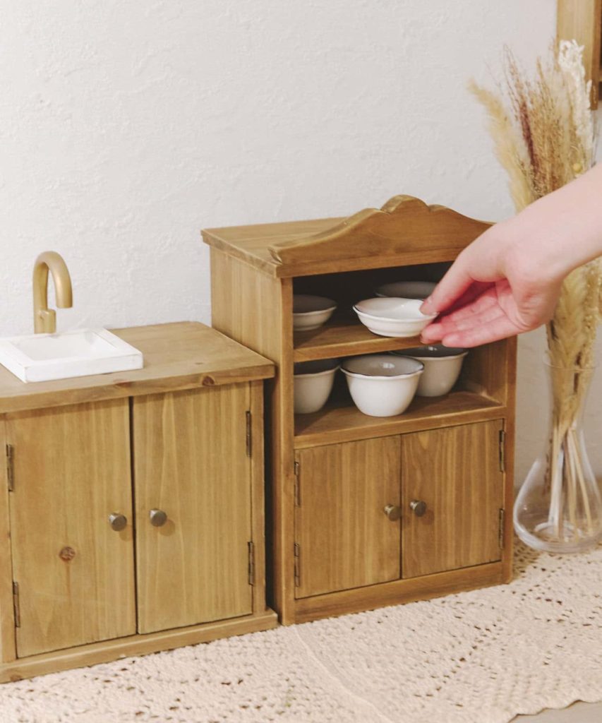 棚にシンクと蛇口がちょこんと付いたこのキャビネットは、素朴であたたかみのあるカントリー調デザイン。木の風合いを感じさせるやさしい佇まいは、ドールやぬいぐるみの世界観にそっと寄り添い、見ているだけでほっこりとした気持ちにさせてくれます。