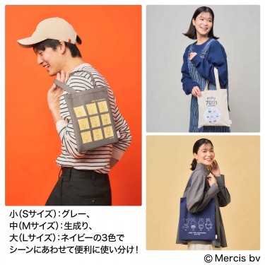 小(Sサイズ):グレー、中(Mサイズ):生成り、大(Lサイズ):ネイビーの3色でシーンにあわせて便利に使い分け!
